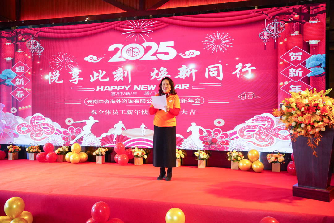 年會(huì )開(kāi)始,亢麗毓董事長(cháng)代表公司董事會(huì )向所有來(lái)賓和全體云南中咨海外的同仁及家人,表示最衷心的感謝和最誠摯的新年祝福??蝴愗苟麻L(cháng)帶領(lǐng)大家回顧2024年過(guò)往,這一年,我們從低谷中奮進(jìn),我們用堅韌超越自我,用汗水鑄就成功,用優(yōu)質(zhì)的服務(wù)贏(yíng)得了客戶(hù)的信賴(lài)和好評。