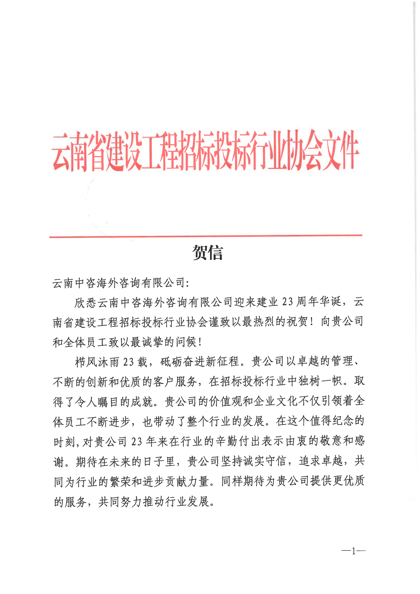 值此春節來(lái)臨之際,恰逢我公司成立23年,喜獲云南省建設工程招標投標行業(yè)協(xié)會(huì )賀信。這封賀信,承載著(zhù)行業(yè)對我們多年拼搏奮進(jìn)的高度認可,飽含著(zhù)對我們深耕前行的熱忱鼓勵。我們將秉持初心,以更高品質(zhì)的服務(wù)和產(chǎn)品回饋社會(huì ),攜手共創(chuàng )美好未來(lái)!