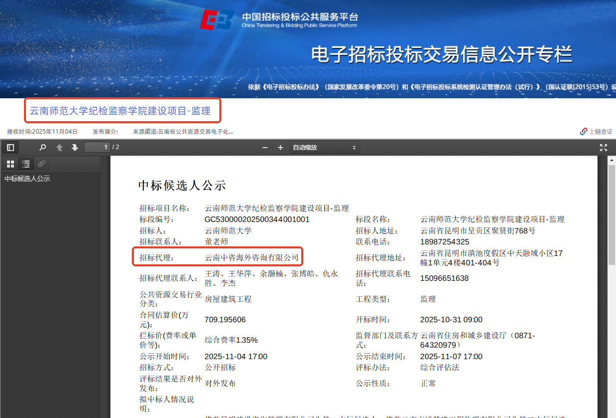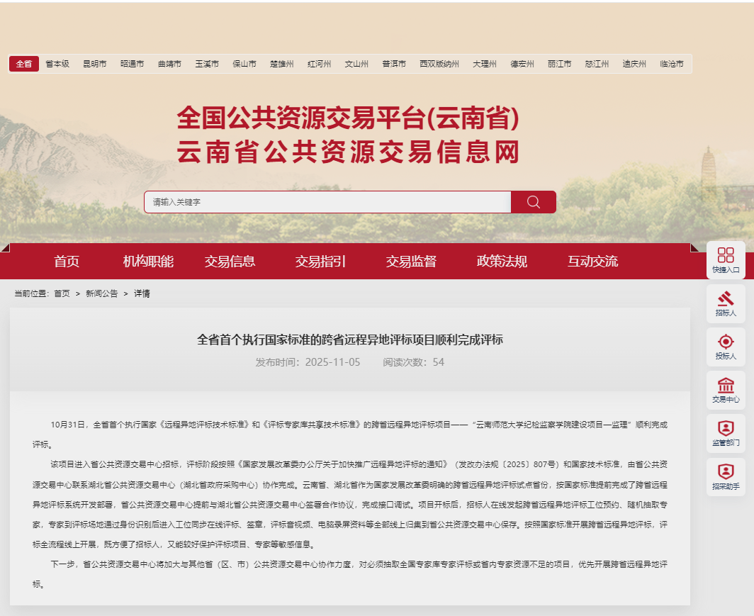 2025年10月31日,“云南師范大學(xué)紀(jì)檢監(jiān)察學(xué)院建設(shè)項目—監(jiān)理”評標(biāo)工作圓滿完成。此項目不僅是云南省公共資源交易領(lǐng)域的重要里程碑,更標(biāo)志著全省首個嚴(yán)格依據(jù)國家《遠(yuǎn)程異地評標(biāo)技術(shù)標(biāo)準(zhǔn)》與《評標(biāo)專家?guī)旃蚕砑夹g(shù)標(biāo)準(zhǔn)》實施的跨省遠(yuǎn)程異地評標(biāo)項目正式落地。作為該項目招標(biāo)代理機構(gòu),云南中咨海外咨詢有限公司以專業(yè)實力與創(chuàng)新精神,助力云南公共資源交易邁入標(biāo)準(zhǔn)化、協(xié)同化、數(shù)字化的新階段。